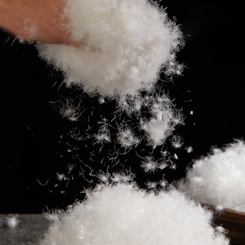 Retirada das áreas do abdômen, pescoço e penugem das asas de gansos brancos de alta qualidade, a penugem natural apresenta uma forma tridimensional agrupada como amentilhos de junco em flor, formando uma proporção áurea com as penas escamosas. Como uma rara fibra de proteína animal, cada fibra de penugem de ganso é coberta por milhões de estruturas de poros microtriangulares. Esses poros precisos são como unidades inteligentes de controle de temperatura, que podem ser ajustadas em nível de mícron com mudanças na temperatura ambiente para construir uma rede de controle de temperatura de ciclo dinâmico. Quando o hálito quente emitido naturalmente pelo corpo humano entra em contato com a camada inferior, a estrutura dos poros ativa imediatamente o mecanismo de absorção de calor e forma uma camada protetora de isolamento térmico multidimensional, bloqueando efetivamente o caminho de penetração do ar frio externo e criando uma experiência de conforto com temperatura constante para todos os climas.